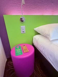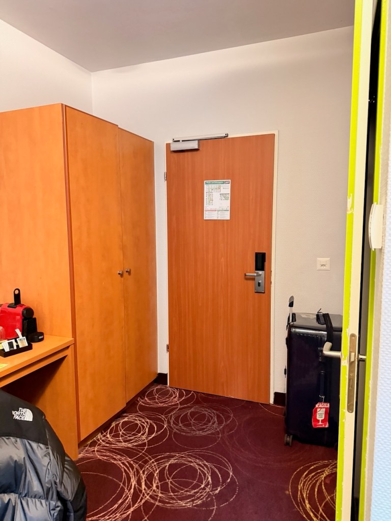 As the name of the room suggests, the Family Room in Ibis Style Luzern City is furnished with not one but three beds. According to the photos of the room from the hotel’s website, the bed placed next to the work desk was supposed to be a sofa bed. However, a regular wooden queen bed was found in place of a sofa bed. I’d rather find a sofa bed here, where we could at least have a sitting area to relax or place our backpacks on. I also find it odd that there are no bedside tables next to the queen bed, showing that the addition of this bed seems to be an ad-hoc addition by the hotel. Opposite the queen bed is a twin bed placed next to each other, next to the only window the room has. I find the mattress on the twin bed very hard, which affects the sleep quality on the bed. It doesn’t help that the pillows provided were too soft for my liking and that the hotel does not offer a pillow menu. Two stools that were supposed to be the bedside tables were installed on either side of the twin bed. Unlike a regular bedside table, where one would at least find a drawer, this stool does not offer any form of storage. The only space for storage is the limited stool top, which was already full when I placed my mobile phone and two other gadgets I wanted to charge overnight.