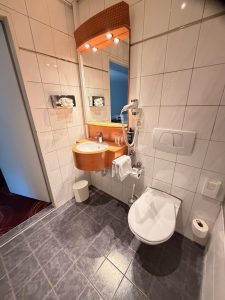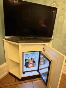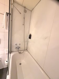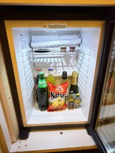 Nestled in a corner of the living room, next to the sofa, sits a minibar table. The minibar table is sparsely equipped with a Nespresso machine and a kettle with tea cups, coffee pods and tea bags. I found it impossible to use both the kettle and the Nespresso machine at the same time, as there is only one power outlet fitted at the minibar table. The wooden table has seen better days, as it wobbles whenever we make coffee out of the Nespresso machine, giving me the impression that the legs will give way at any moment. We found a cabinet sitting in the corner opposite the minibar table. This cabinet (that we never used) could have been repurposed for some other functions, but finding a cabinet here is indeed out of place. Placed in the corner next to the bedroom is a TV cabinet. That is where we could receive entertainment from the TV positioned to face the sofa. Unless we understand French or German, there are very few channels, mainly news channels in English, that we can receive entertainment from the TV. The in-room minifridge is tucked inside a cabinet underneath the TV, stocked with chargeable drinks.