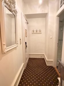 The entryway is fitted with a mirror and some hooks and is also home to the bathroom entrance