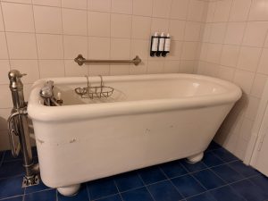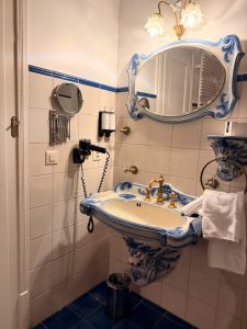 Unlike the entryway (or the other parts of the suite), the bathroom predominantly uses blue colour, seen in the floor tiles and the furnishings such as the toilet, the bidet and the sink. Right next to the entrance of the bathroom stood the walk-in shower. Fitted with both a rain shower and a regular shower head, the space afforded by the walk-in shower felt a little tight. The glass screen doors also felt a tad flimsy. A large, deep-seated bathtub sits across the walk-in shower. This tub has seen better times, as there are scratches visible on the tub. To our dismay, we subsequently found out that this tub is currently used as an antique display piece after checking with the hotel reception when the water is not flowing from the taps. We were informed that the hotel was not able to find the spare parts to fix the tap, and owing to a strict Swiss law, the hotel was not able to remove or replace the bathtub. A European bidet with a blue gryphon carved onto the base is found next to the bathtub. As we did not use the bidet (rather, we were not used to the European bidet), we couldn’t confirm if the bidet is working or, like the bathtub, is merely a display piece. Opposite the bidet and next to the walk-in shower, positioned the (literally) porcelain throne. Like the bidet, the toilet is also engraved with a gryphon painted in blue at its base. Fortunately, the toilet was in working order.