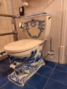 The toilet bowl has an elaborate gryphon carving