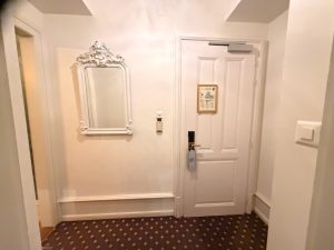 The heritage of the Royal Suite can be witnessed from the entryway. From the brown carpeting to the mirror, it seems that this suite has withstood the test of time. The entryway in the Royal Suite at Hotel Royal St Georges is a short corridor in the suite that links the main entrance to the living room of the suite. I found the three hooks fitted in here, next to the entrance to the suite, very convenient for us to hang our outer coats before entering the room. The presence of these hooks also gave us a place to stow our outer coats rather than finding a space in the suite to hang them. Mounted on the wall of the entryway is a mirror that allows us to do a final appearance check before heading out. The frame of this mirror suggested that it might have been in this suite for a long time. The entrance to the only bathroom in the Royal Suite is situated in the entryway, opposite the mirror.