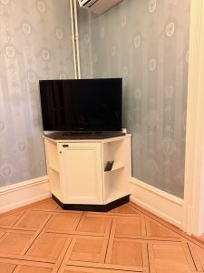 The TV console sitting in a corner of the living room