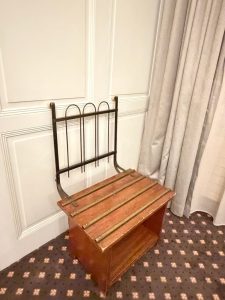 There is a small vintage luggage rack in the bedroom