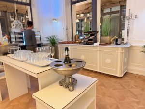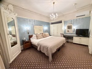 The living room is the next room that the entryway leads to in the Royal Suite. Decked in blue wallpaper and parquet flooring, and together with the patterned cornice, the living room presents a vibe of yesteryears. The furnishing is a mix of modern and historic in the living room. A side table is positioned next to the entrance of the living room from the entryway. This somewhat oversized side table is equipped with a large lamp, which brings a sense of cosiness to this space. I found the sitting situation to be a little thin in the living room. Other than a large fabric two-seater sofa that can sit three adults, placed next to the side table, the only other sitting space in the living room is a single-seater armchair opposite it. To make matters worse, instead of a regular coffee table, the living room is furnished with a small dining table in the middle of the room. The height of this table is too high to be used as a coffee table or even dining table when seated on the lounge sets, or useless as a dining table due to a lack of dining chairs.