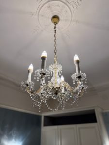 The chandelier in the bedroom brings about a vintage vibe and a sense of lux