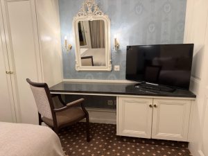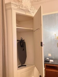 Fitted onto the wall to the left of the king bed is a set of two white wardrobes. The single-panel door innermost wardrobe is fitted with shelving that allows us to stow small clothing items, while the two-panel wardrobe reveals a hanging rack that is capable of hanging at least two weeks’ worth of clothing. The Royal Suite in Hotel Royal St Georges is not furnished with a work desk. We had to rely on the vanity table in the bedroom next to the wardrobes to perform any work. The vanity table would be sizeable if not for the TV that is placed at the end of the table. As a vanity table, the large mirror with a similar design to that in the entryway allowed guests to put on makeup or style their hair. As a work desk, the power outlets installed on the wall allowed guests to keep their laptops powered up. There is another cabinet, similar to that in the living room, on the right side of the bed, occupying the corner. Here is where the hotel stores the in-room ironing equipment. We also found a wooden luggage rack by the entrance to the bedroom. However, its size is too small to hold our 28” trunk luggage, and we ended up using it to place our backpacks.