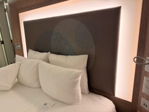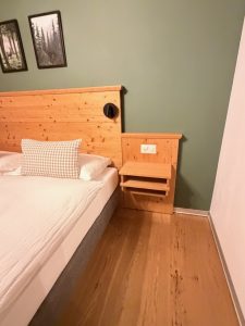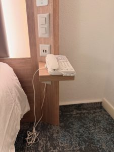 The bedside table is just a wooden plank wedged into the headboard of the king bed and provided us with limited space for our lifestyle devices