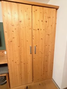 A chaise lounger is located at the other corner of the living room, by the door to the bedroom. The brown fabric chaise lounger not only can comfortably sit three, but it can also be used as a daybed. The only coffee table in the living room is placed in front of the chaise lounger. The wardrobe in the living room opposite the chaise lounger, capable of holding at least one week’s worth of clothing, seems to suggest that the living room of the Superior Suite might have been used to be a Junior Suite. The TV in the living room is mounted on the wall facing the sofa bed, and can be tilted to face the chaise lounger or the sofa placed by the window at the end of the living room. Despite having many channels for us to choose from on the TV, only a handful of these channels are in English. Most channels are either in French or German.