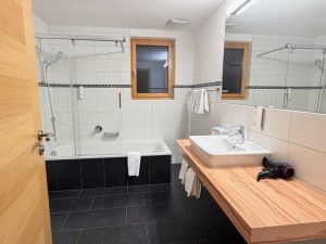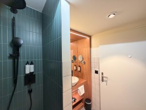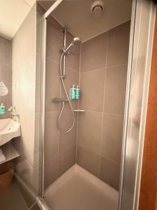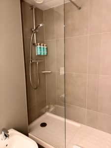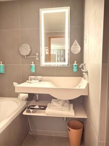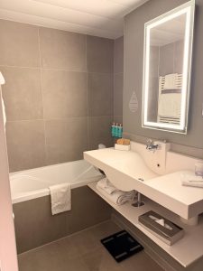 The bathroom in the bedroom is the second bathroom in the Superior Suite at Novotel Genève Centre. This bathroom is smaller than Bathroom 1 in the living room, equipped with only a shower and bathing facilities. The sink lies in the centre of Bathroom 2, which only has a small countertop space on the left side. A bathtub, having the same size as the one in Bathroom 1, is located on the left of the sink, while a walk-in shower lies to the right of the sink. Due to the space allocated to Bathroom 2, the walk-in shower is smaller than that in Bathroom 1, and there are no toilet facilities in Bathroom 2. Not only is the space in Bathroom 2 reduced, but the amenities are also reduced, such as the absence of conditioners. Despite the “reduced” bathroom, I thought Bathroom 2 still functions as a full bath.