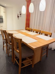 The lounging area is immediately next to the main entrance and features Scandinavian decor, with woody tones from the flooring to the sofa. The sofa, which can comfortably sit two, is placed next to the main entrance to the Superior Studio and can be converted into a bed, which would increase the capacity in the studio by an additional two guests. In fact, the sofa was converted into a double bed when we first entered the Superior Studio. Instead of a large coffee table, I like how the hotel uses small round tables that not only save space but can also double up as stools for more people to sit on. There are three such stool-tables in the living room of the Superior Studio, one placed in front of the sofa, another placed next to the sofa, and yet another placed by the floor-to-ceiling window. I thought that not furnishing a TV cabinet was a great idea, as having a TV cabinet would clutter the lounging area due to the space allocated. The TV in the lounging area is mounted on a wall, opposite the main entrance and at a corner of the living room. Aparthotel Adagio Zurich City Centre is one of the few hotels that I have stayed in Switzerland that offered its guests more English channels. The placement of the TV with a pivoting mount allowed us to watch the TV while dining in the dining area. The living room, from the lounging area to the dining area, has a total of three floor-to-ceiling windows that open up to a French balcony. These three windows allowed lots of natural light into the living room and created an indoor-outdoor concept. They also made the elongated living room feel larger.