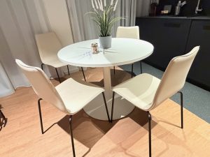 The dining area is furnished with a round dining table with four chairs