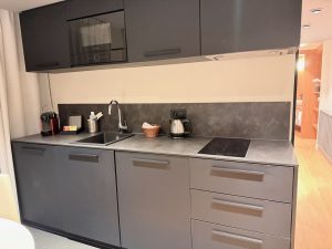 The dining area & kitchenette took up about ⅓ of the living room space. Placed between the lounging area and the bedroom, the dining area is furnished with a suitably sized round table with four accompanying leathered seating dining chairs. As there are no work desks in this Superior Studio, the dining table also doubles up as a work desk. Behind the dining table is a kitchenette that has all one needs to whip up a simple meal. Other than a sink and the usual Nespresso Coffee machine and mini fridge, the kitchenette also has a two-stove induction cooker, a microwave oven and even a dishwasher. Aparthotel Adagio Zurich City Centre also equipped its Superior Studio with a full set of dining set for four, together with pots and pans. I like how the kitchenette, despite a small footprint in the Superior Studio, was able to function as a full kitchen with the many amenities the hotel provided.