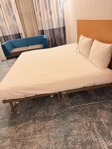 A king bed is placed next to the entrance to the bedroom from the living room. The king bed was comfortable with a firm mattress, but the sleep quality on the king bed was impaired by the soft pillows that were provided. Those who prefer softer pillows might find better sleep quality on the bed than I do. The bedside tables in the bedroom are essentially two wooden planks that were wedged into the headboard of the king bed. The space afforded by these bedside tables is a little tight, which provides us with little space to place our lifestyle equipment to charge overnight. To make matters worse, the phone placed on the right bedside table took up the entire space, rendering this bedside table useless. It also doesn’t help that only one side has a power outlet, while the other only comes with two USB-A charging outlets.