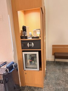 Weirdly, there is another entrance to the suite via the bedroom, hence a second entryway for the suite. Like the other entryway, Entryway 2 is only furnished with the wardrobe in the bedroom, and it is also home to the entrance to the Powder Room. The wardrobe has only hanging racks, which limits the amount of clothing we can stow. The limited number of hangers the hotel supplies further limits the number of clothes we can hang. Despite having a ledge above the hanging racks, we found little use for this rack. Next to the wardrobe, and facing the bedroom, is where we found the second minibar and the second in-room safe. A second Nespresso machine, an electric kettle and a second set of coffee capsules and tea bags occupy the open shelving space on top of the safe. In contrast, a second mini fridge is situated below the safe.