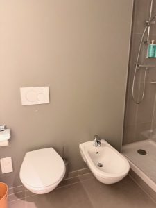 The Powder Room is a weird situation in the Superior Suite at Novotel Geneva Centre. The suite does not have a powder room per se, rather it has a toilet that is separated from the bathroom in the bedroom. The toilet is situated in the entryway next to the second entrance to the suite, akin to a powder room. However, unlike the powder room of other hotels, the powder room in the Superior Suite only houses the porcelain throne and does not have a sink. The space allotted to the powder room is rather modest, and the absence of a sink makes it inconvenient to use.
