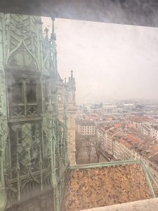 Our main purpose of visiting St. Pierre Cathedral is to climb up to the two towers, which would give us a panoramic view of Geneva. There is a fixed route that we were required to follow when climbing up the towers. The tower visit started with climbing 160 steps via a narrow spiral staircase to the top of the south tower, near the ticketing counter. Halfway through the climb, we came to a wooden open space with signs pointing us to the correct way to the top of the tower. Here is where we spotted an enclosed wooden room with some large bells. These bells, some dated back to 1481, were the bells that are responsible for the chimes we heard at the strike of the hour. There is a small balcony at this level that we can look out of into the city. We continued our climb to the top of the spiral staircase, which led us to a small wooden room. According to the ticketing staff below, this room was a watch tower to look out for fires back in the days. The views up here are great, but were somewhat affected by the stains on the glasses of the window. Despite being able to see the city below and parts of Lake Geneva, we couldn’t see much, partly due to the fog and partly due to the obstruction by the other towers of the cathedral.