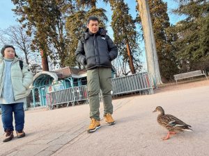 My friend crossing the bridge to the north tower