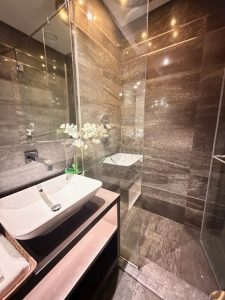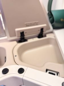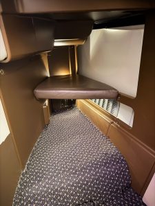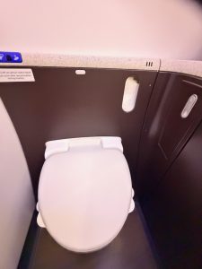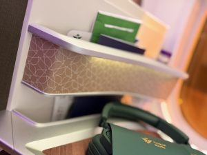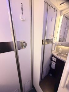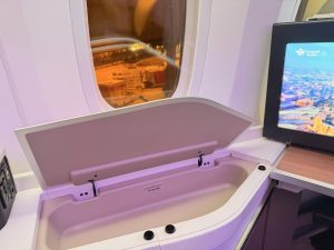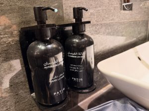 There are three lavatories, one in the front of the aircraft and two at the back between the Business Class and Economy Class cabins, serving all 24 Business Class passengers on Saudia’s B787 series aircraft. The dark brown used in the flooring and the cabinetry in the lavatory gave it a distinct, posh look. While the lavatory was not large, the mirrors on its walls made it feel larger. The lavatory was stocked with Saudia’s in-house Eau de Parfum, hand lotion, and facial mist to differentiate the premium-class lavatory from the Economy Class.