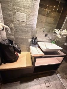 The toilets are situated next to the cinema in the Atrium Hall area of AlFursan Lounge. There are two shower rooms (at least for the male toilet) located inside the toilet. As there are no counters to book these shower facilities, their use will be on a first-come, first-served basis by asking the attendant in the toilet. The bathroom in the AlFursan Lounge, having a wet walk-in shower and a dry sink area, looked rather dilapidated. Despite being their flagship lounge and decked in luxurious black marble tiles, the condition of the walk-in shower had seen better days. The panel on the wall suggested a hand-held shower head, but only the rain shower head was installed. To make things worse, there is a large, ugly patch on the wall of the shower that seems to suggest that the mountings had been removed. The attendant passed us a set of shower amenities, including towels, shampoo, conditioner and body lotion. But I was informed that they ran out of shower gel.