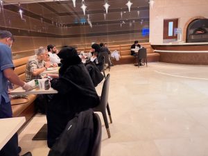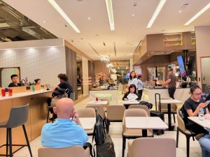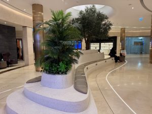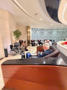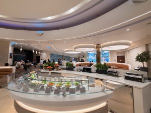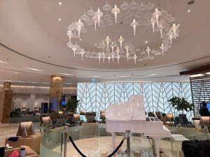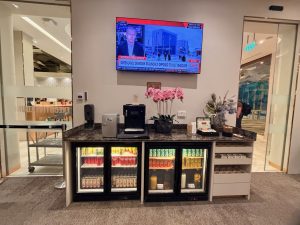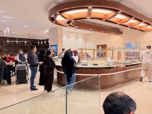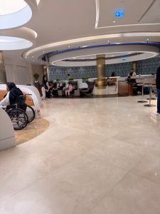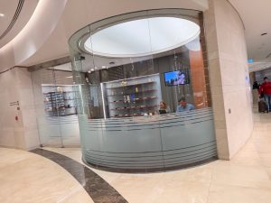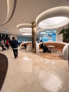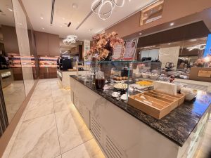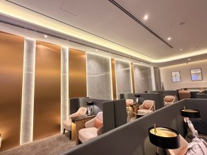 The main lounge sits right across a small bridge. My first impression of the AlFursan Lounge was that it felt elegant, spacious, and luxurious, with its Atrium Hall featuring white marble and gold-plated pillars. The first thing that caught my eye was the white grand piano sitting in the centre of a circular space, and the olive tree at the side of the Atrium Hall. Saudia furnishes the space around the grand piano with single-seat armchairs that are not only comfortable but also provide seating for passengers to enjoy the performance (if one is ever scheduled). Most of the spaces in the AlFursan Lounge are circular, which creates a comfortable atmosphere. Beyond the grand piano is a small beverage station and a chocolate and dessert bar. A meeting room is also found in this space, next to the chocolate and dessert bar. I found it interesting to find a small duty-free shop inside the AlFursan Lounge, near its entrance. There is also a small cinema seating up to 6 passengers located beside the duty-free shop in the lounge.