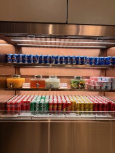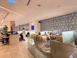 Past the main dining area, we found more circular booths and some individual armchairs. This is the quietest part of the lounge. In addition to more lounge seating, this part of the lounge features a salad bar and a small dining area. There is a beverage bar counter, serving non-alcoholic drinks, also located next to the salad bar. Overall, I thought the AlFursan Lounge was a great place to spend time while waiting for our next flight. The sheer size of the lounge allowed passengers to spread out, making it feel less crowded.