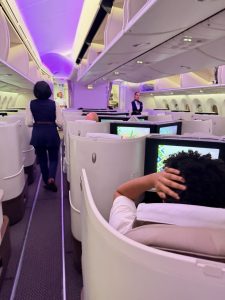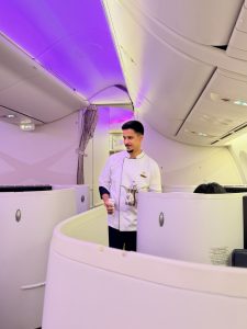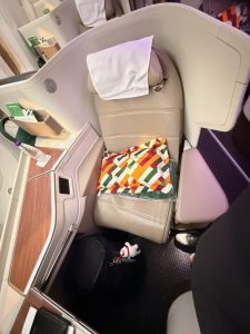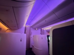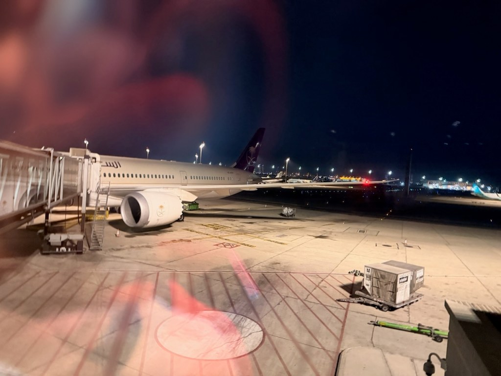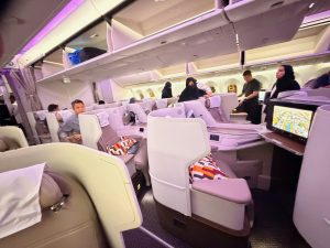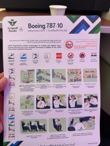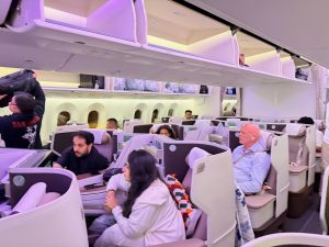 The boarding situation is chaotic. Rather than boarding by classes, Saudia boards everyone at the same time through one door, which impacts the boarding experience for Business Class passengers. Like most airlines, the cabin crew welcomed us onboard at the door and directed us to the correct aisle for our seats.