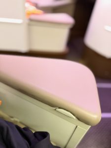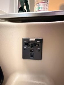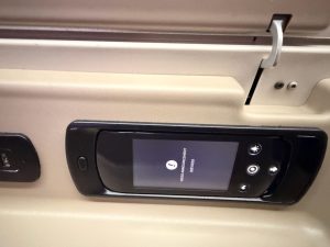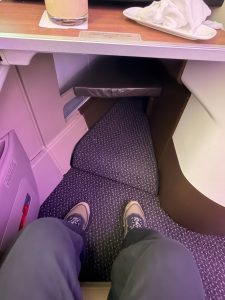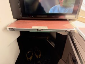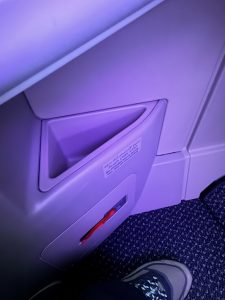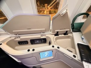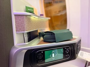 I thought the storage in the Business Class seats onboard Saudia B787 series aircraft was very generous. Despite the lack of a small cabinet on the side tables, there are still plenty of storage options in these seats. Right in the adjustable armrest on the aisle side of the seat lies a small compartment, large enough for the airlines to stow the provided headphones or bottled water. The main storage is found under the side table between the two seats (for those sitting in the middle couple seats) or at the window. This is where a slight difference between the -9 and -10 series aircraft. There is only one large compartment beneath the side table on the -10 series Business Class seat, whereas there are two smaller compartments underneath the side tables on the -9 series Business Class seats. On top of that, the IFE controller and the charging outlets are exposed on the -10 seats, whereas these are hidden in the larger compartment on the -9 series. Personally, I prefer the two smaller compartments in the -9 series Business Class seats as I thought they provided slightly more storage space, in addition to making the seat look cleaner with the IFE controllers and the charging solution tucked away when not in use. The -9 series also made organising the storage easier, where I could place my smaller items like passports and charging cables when not in use in the smaller compartment. There is another storage area in the small cubby near the calf area inside the seat. I was also able to use the space under the footwell to place my carry-on.