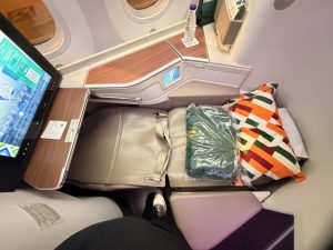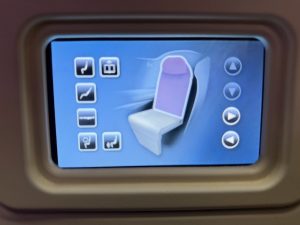 Business Class seats onboard Saudia B787 series aircraft are arranged in a 1-2-1 configuration. The dual-tone sand-coloured leather seat has a generous seat pitch of 78” and measures 21” wide. The aisle side armrest can be lowered to give the seat a more generous width. Like most Business Class seats, these onboard Saudia B787 seats come in three standard configurations—Take-off/landing, lounge, and bed modes —which can be activated using the touchscreen seat control panel. The seat felt comfortable even in its most uncomfortable upright position for take-off/landing, thanks to the thick padding and the soft leather used in these seats. In bed mode, the seat can recline to 180°, turning it into a comfortable flatbed on which we had a great sleep during the flight. Despite not having any doors in these seats, I still find a good amount of privacy in bed mode thanks to the high back of the seat. The lounge mode sits between the upright and flatbed modes, which are angled to provide passenger comfort. I like how the angles in these seats can be further adjusted, giving passengers the freedom to customise the seat angle to their preferences.