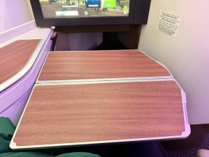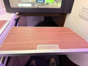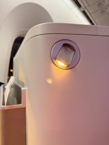 Saudia B787 series aircraft Business Class is fitted with a large wooden table. It is even useful when stored under the IFE screen, with ⅔ of the bi-fold table sticking out, giving us a good amount of space to place our drinks. The table, when fully deployed, is rather sizeable and sturdy, which is perfect for meals or for doing some work. When it comes to illumination in the seat, aside from the overhead reading lights, airlines installed a smaller reading light. I like how the aircraft is fitted with air nozzles, giving us some freedom in adjusting the temperature in our seats.