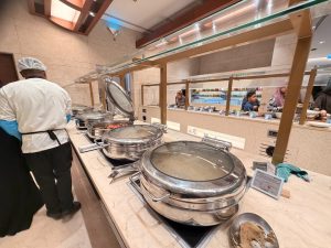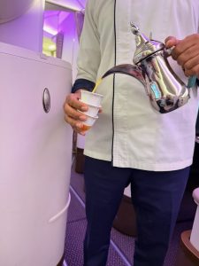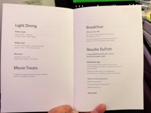 The service onboard this leg was good, with a very attentive cabin crew. Despite not having smiles or striking conversation, she was observed to be attentive, and I felt very well taken care of by her. Although the service on board seemed to be taken from a page of the airline’s SOP and executed by a very well-oiled crew, I could feel the attentiveness of the cabin crew working on my aisle. We were promptly served a welcome drink and a hot towel after settling into our seats. I noticed that the cabin crew onboard Saudia did not wait for everyone to settle into their seat and started the welcome drink service. Instead, whenever a passenger was observed being settled into their seat, the cabin crew would approach us with our welcome drinks, which explains why they were seen walking up and down the aisle so frequently. I thought the Arabic coffee presentation was rather unique to Saudia. The onboard chef would go around the cabin asking if we wanted some Arabic coffee and gave us some dates at the same time. Orders for meal options and our preferred meal time were taken during taxiing. Throughout the flight, the cabin crew was kept busy with the different meal times. And when she walked by and saw that I was still awake, she offered to serve my light meal. After clearing my table, the same cabin crew came over to my seat with a tray of snacks, and at the same time, checked if I wanted any drinks to go along. During breakfast time, the cabin crew, seeing that I was awake, quickly heated up my breakfast order and served it after seeing I was settled down. The attentive cabin crew quickly cleared my table.