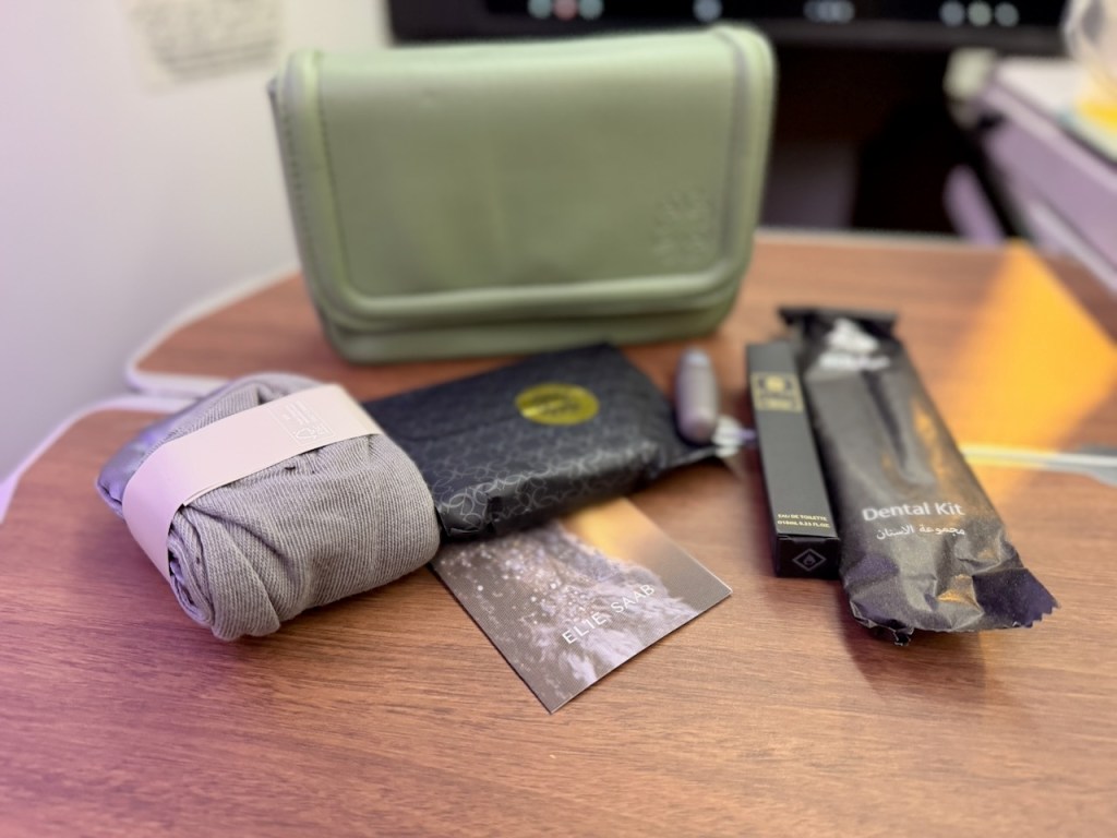 For this leg, we were presented with the newly released ELIE SAAB amenity kit shortly after boarding. The amenity kit was housed in a PVC leather ELIE SAAB pouch containing products such as face cleanser, hand and body lotion, lip balm, as well as an ELIE SAAB Eau de Toilette, alongside eyemasks, dental kits and socks. There are different ELIE SAAB amenity bags for male and female passengers, but the contents are identical for both kits.