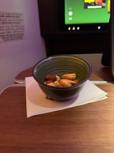 Saudia did not have a fixed meal time for its Business Class passengers, but offers a dine-on-demand concept. Saudia served two meals for our 9-hour flight to and from Jeddah: a light meal service and a breakfast service. As both legs of our flight started at night, the cabin crew on both legs of our flight checked when we wanted to have the light meal. Saudia served warm nuts after the aircraft reached cruising altitude as a pre-meal service.