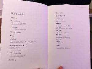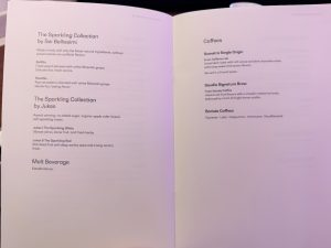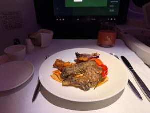 For our inbound flight, the three choices for light meal were Arabic Mezze, Wedge Salad and Mixed Grill. I had the Mixed Grill that comes with Beef Kofta, Lamb Cutlet and Chicken Shish Tawook. The beef and lamb were cooked to perfection; both were tender and juicy. The chicken on the plate was also tender and very well-spiced. However, the minty tahini sauce was not to my liking. For breakfast, we could also choose from the two menus: Saudi Sufrah or à la carte. Originally, I wanted to opt for the Saudi Sufrah, but I was told they had run out of that option despite being in the first three rows. I had to choose something from the à la carte menu. In this à la carte menu, we were also given three choices each for starters and mains. For starters, we were given the option of Cheese and Cold Cut Platter, Strawberry Muesli, or Fresh Fruit. I went for the Fresh Fruit, which was sweet and fresh. The options for mains were Seafood Congee, Organic eggs prepared onboard and Belgian Waffles. I opted for Belgian Waffles, which were delicious and flavourful. The burnt banana added the punch, and the caramel was tasty. But overall, as a dish, I find it too sweet.
