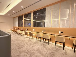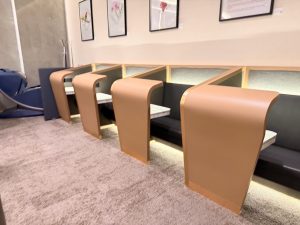 In the same area as the buffet are the toilets and shower rooms. There are two shower rooms available on a first-come, first-served basis. These shower rooms are rather basic, with only shower facilities, and lack places to put our carry-ons. Given the size of the lounge, I thought having the shower facility was great, especially for transiting passengers who wanted to freshen up between their flights. The lounging area occupies most of the lounge floor, featuring armchairs arranged in caccoons for four and high-back solo seats for those who want more privacy for work or rest. The lounge is also furnished with solo armchairs in a somewhat more enclosed area, which is great for solo passengers who did not manage to snag the high-back work pods. Like the caccoons for four, each seat is fitted with an accompanying side table for passengers to place their drinks on. The lounging area felt open and airy, thanks to the high ceiling that it shares with the terminal building. The lounge area gives passengers a partial view of the tarmac. The lounge also features two massage chairs in a quieter corner.