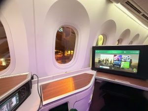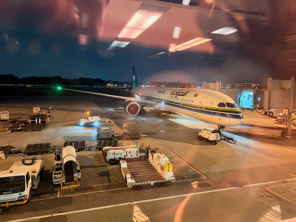 Saudia operates two versions of the B787, the -9 and -10 series, to and from Singapore. We took the B787-10, decked in the new white with green stripes livery for the Singapore-Jeddah leg and the B787-9 in the old cream coloured livery on the Jeddah-Singapore leg. Both -9 and -10 versions have the same number of Business Class seats, but more Economy Class seats on the -10 version.