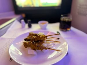 For the light meal on this leg of the flight, the three options that we had on the menu were Arabic Mezze, Chicken Satay and Lamb Kofta. I chose the chicken satay, which I found to be delicious. The chicken was tender, and the peanut satay sauce was flavourful. For breakfast, we could choose from the Saudia Sufrah set or from the à la carte menu. The à la carte menu breakfast came in two courses, and we were given three choices for both courses. For starters, we can choose between Greek Yoghurt, Fresh Fruit and Seared Halloumi; while the mains were a choice between Lamb Fettah, Organic eggs made onboard and Vanilla Pancakes. I opted for fresh fruit for starters and Lamb Fettah for mains. The fruits served were sweet and juicy, and the lamb was flavourful and well-spiced. There is a side dish of two pastry puffs that were stuffed with spinach. I am not a fan of these puffs due to personal preference.