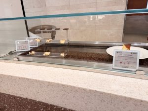 As we walked further into the lounge, we came across four large circular booths, ideal for larger groups. There is even a small refreshment station in this space, providing passengers with great convenience. Behind these circular booth seats are five Slumber Rooms. These semi-open sleeping rooms feature a daybed (no bedding), a side table, a coat hanger, and a floor lamp, making them ideal for passengers who want to catch a snooze. However, I find the lack of privacy a downside (unless one is lucky to snag the corner room). Past the circular booths, the lounge layout shifted from circular to rectangular, with distinct functions: the lounging area on the right and the dining area to the left. The lounging area, fitted with softer lighting to create a more relaxed atmosphere, is furnished with lots of lounging armchairs arranged in pairs and groups of four. The dining area on the left features a pizza station where a staff member bakes pizza upon request, and the main buffet line is further into the lounge. I found the food selection at the AlFursan Lounge quite substantial. There are Middle Eastern and a small selection of Western options made available in the buffet line. Next to the buffet line are also many dining tables, mainly seating two to four passengers. Having the dining tables here made it convenient for passengers to grab food from the buffet line.