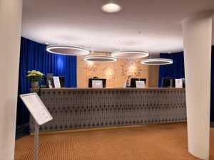 The hotel lobby in front of the reception