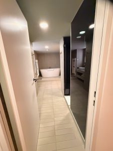 The corridor that leads to the walk-in shower and toilet in the bathroom