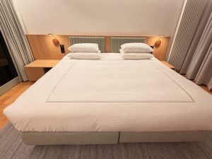 On the other side of the false wall lies the bedroom, which has the same natural wood Scandinavian design language as the living room. The bedroom has a minimalist decor, furnished with a king bed and a vanity table. The king bed, which occupied the bulk of the bedroom space, is topped with a firm mattress that provided us with great sleep quality, which kept us refreshed after our one-night stay at Swissôtel Kursaal Bern. Usually, I am not a fan of soft pillows, but I was still able to get a great night’s sleep despite the soft pillows used by the hotel. A large natural wood bedside table flanked both sides of the king bed. These bedside tables gave us a generous amount of space to lay out our lifestyle devices, including my iPad, and other knick-knacks to charge overnight with the European power outlet and two USB-A charging ports. I like how Swissôtel Kursaal Bern kept the bedside tables clean by mounting the bedside lamps onto the headboard on both sides, and was free of an in-room phone. Unlike most bedside tables, these tables were not fitted with drawers that increase the storage capacity. Instead, there is one open shelf on these tables, which somewhat limits the number of items we can stow here. However, the generous tabletop space was more than sufficient for us to place our stuff. The advantage of such a design is that we will not forget things that are placed on these bedside tables. At one glance, we were able to tell if we had unintentionally left things behind.