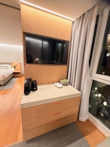 Next to the wardrobe are two double-panel wardrobes, marking the start of the living room. Hidden inside these wardrobes, which the hotel termed as Vitality Closet, are workout equipment. The closet next to the wardrobe features a wooden wall bar and some yoga mats. This system allowed us to do some core training and stretching. The closet next to the wall bar is fitted with sandbags of various weights and some sort of pulley system. This machine serves the same function as the functional trainer that we would see in gyms. The pulleys and the weights allow us to perform functional and strength training without needing to leave the room. There is a small LED TV installed in the Vitality Closet, but we couldn’t figure out how to turn it on. I suspect this TV would be loaded with workout videos that would guide us through the various training in the suite.