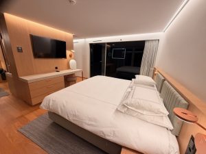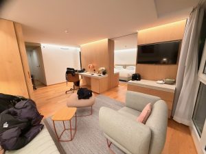 The sleeping area took up most of the space in the Family Room. I like how the hotel maximises the space usage by fitting a large work desk cum TV console next to the wardrobe. This table, made of solid wood, is also home to the minibar in the room. Speaking of minibar, we only found a Nespresso machine and no mini fridge in the Family Room. Although the hotel offered tea bags as part of its mini bar setup, there is no kettle in the room that allows us to boil water for making tea. Despite having multiple functions, I still find space to work on the work desk. The TV in the Family Room has very limited entertainment options and offers us only local channels to watch.