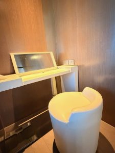 Perhaps the only space in this water element, the SO/ Lofty Suite, that took a departure from the dark tone is the wardrobe in the bed area. Instead of having a dark tone, this part of the suite is laid with natural wood colour, which seems to be for practical reasons. As there were no views in this part of the site, the lighter colour tones used here allow guests to perform functions that are allocated to this part of the suite better. I like how SO/ Bangkok designed a walk-in wardrobe in the bedroom of the suite, with a sliding door that gave the separation between the wardrobe and the bedroom. The wardrobe space employs an open design fitted with only hanging racks. Other than the ledge below the hanging racks, which we used to place our luggage and the oversized drawer below, we found a lack of shelving for us to stow our smaller clothing items. Shelving space is limited to the two built into the wall of the wardrobe, of which one is used to house the in-room safe. While we still have the other shelving to use, I find it awkward and difficult to access. Fortunately, SO/ Bangkok furnished the vanity table inside the walk-in wardrobe, which we used to place our smaller clothing items on.