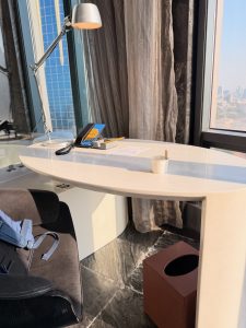 The king bed faces the quadrant floor-to-ceiling windows that curve towards the bed, giving us views of the city from our bed. There is a fairly large space between the windows and the bed. This is where the hotel filled the void with a circular armchair and a small coffee table. This grey fabric chosen for this armchair complemented the dark grey palette used by the designer, continuing the sophistication and calm vibe we had seen in the other parts of the suite. The armchair is very comfortable to sit on, allowing us to laze, focusing our attention on the bustling city. Another 55” LED TV is placed just a little shy of the window facing the king bed. A small work desk facing the city skyline is fitted in one corner of the bedroom, with the power outlets fitted on the ledge beside the work desk. This is a perfect spot for guests to do some work. The ledge also gave us additional space to place things like documents.