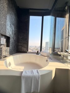 The bathroom was allocated a good amount of space. The massive wooden sliding door separates the bedroom from the other bedroom. Right in front of the sliding door sits a dual sink. For a sink of this size, I thought the countertop space was a tad limited due to the larger-sized sinks the hotel used in the SO/ Lofty Suite. After placing a large amenities box in the centre of the sink, we were left with little space to stow our toiletries. Other than insufficient countertop space, we also found a lack of hanging spaces. There is only one hook in the bathroom, which limits the number of clothes we can hang here. The issue became more pronounced when we needed a space to hang our bath towels to dry for the next day, and at the same time, our clothes when we took a shower. More often than not, we found water splashing out of the sink due to the force from the sink, if we were not careful with turning the water from the tap to the “right” amount of pressure. SO/ Bangkok fitted the porcelain throne on the left side of the sink countertop, behind a shallow wall. There are no doors to segregate the toilet from the rest of the bathroom. The walk-in shower took up the bulk of the area in the bathroom, located to the right of the sink next to the floor-to-ceiling window. I like how the hotel placed the massive round bathtub (by the window) inside the walk-in shower. This allowed us to head straight for the shower after taking a relaxing soak, looking out into the skyline of Bangkok. The bathtub took a while for the water to fill up, partly due to the oversized bathtub and partly due to the weak water pressure.