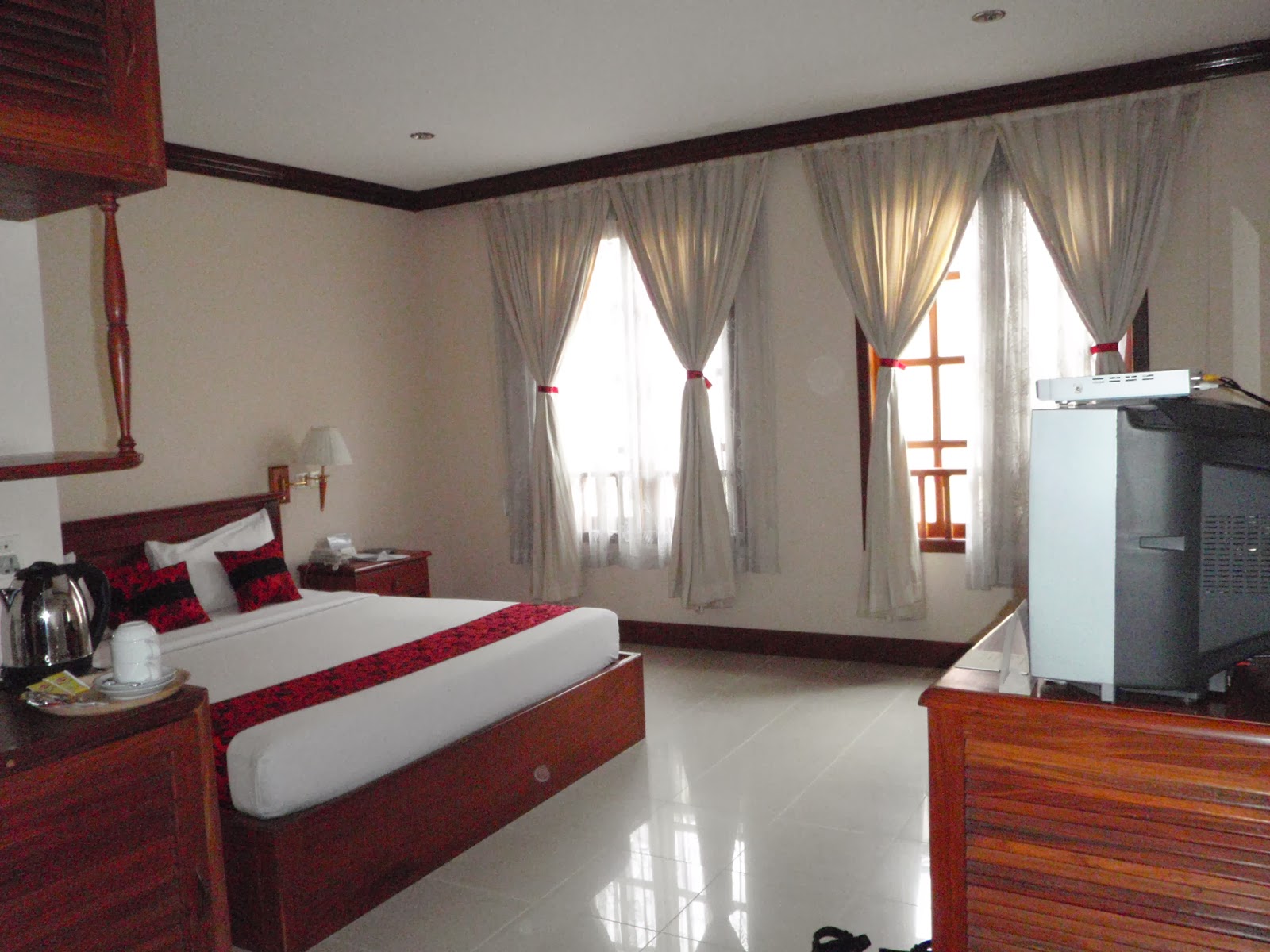 The 38-room hotel is housed in a 4-storey building. The room I stayed in is double-deluxe. The rate comes with breakfast and complimentary airport pick-up and drops off. The room features a sleeping area and a bathroom. It was simply furnished with a queen-sized bed and the sleep comfort on the bed was alright, did its function by providing me with decent sleep. The air conditioning in the room was good, provides one with the much needed cool air amidst the hot and humid weather in Siam Reap. The sleeping area has a CRT TV and a corner for refreshments. The mini bar was tucked nicely into the shelving of the room, right below the refreshment corner. The size of the room is rather big and there is ample room for one to lay their luggage. The room is very clean, despite the dusty environment just outside the hotel.