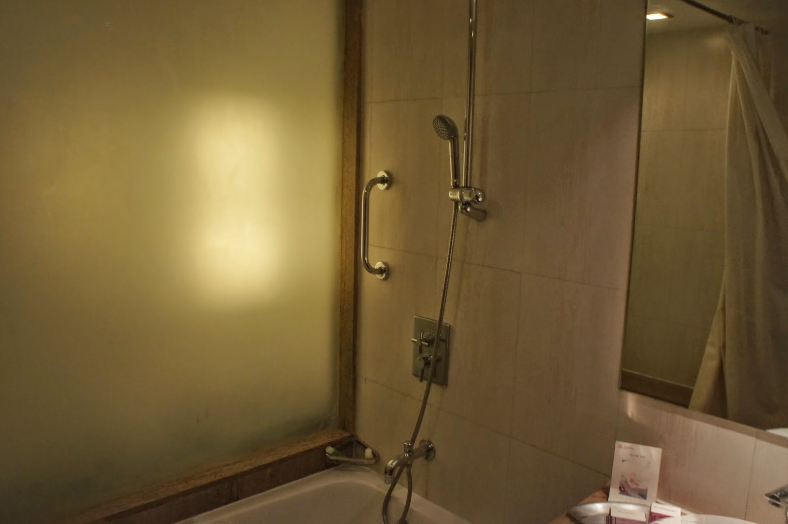 The room in the hotel is fairly large for the class of the room. Once entering the room, a corridor leading into the sleeping area welcomed me. To the right of the corridor is the bathroom area. The bathroom comprises of the standard bathtub, which has the showerhead together with it. The tub is placed right next to a huge glass wall, which was somehow tainted to provide more privacy. Next to the bathtub is a single sink, which is placed rather close to the tub.  The toilet is situated on the other corner of the bathroom. The bathroom is just the right size and is rather functional.