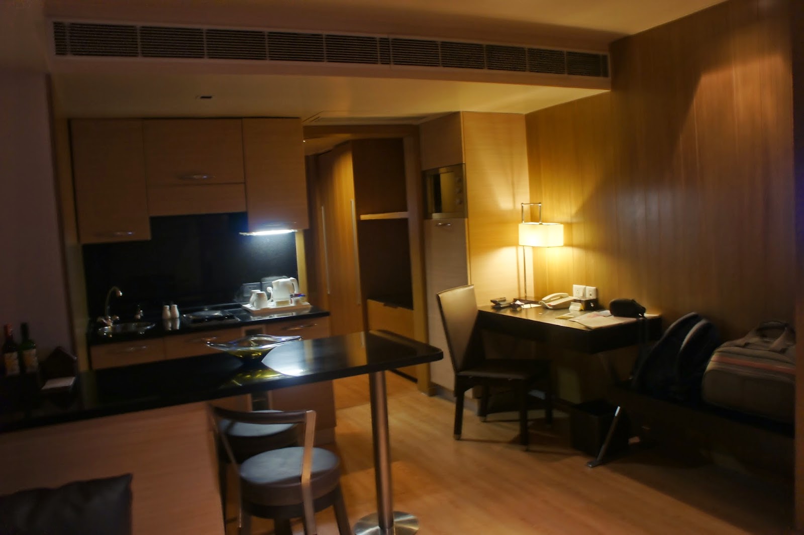 Connected to the living room is a kitchenette, which has a stove and microwave oven.  It is sufficient for guests to do simple cooking. Together with the kitchenette, cooking utensils such as pots and pans are also available in the room. In between the kitchenette and the living room is a simple yet functional bar table for guests to do their dining. There is also a study table next to the kitchenette where one will be able to do some work and connect to the wired internet. Wireless internet is not available in this hotel.