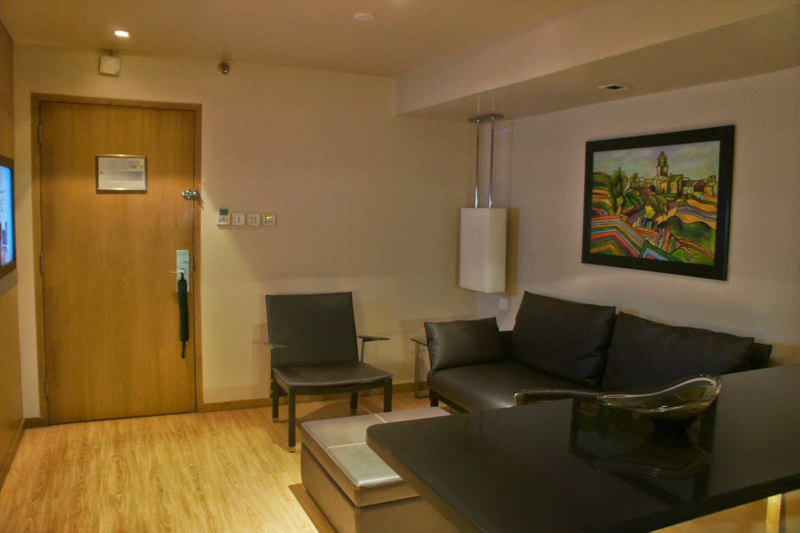 I checked into the one-bedroom apartment suite. Upon entering the room, a living room was immediately spotted. The living room comprises of a 2 seater couch and single-seater chair, together with a nicely designed coffee table. There is a large LCD TV placed in front of the living room. The design of the living room is very contemporary and the furniture placed inside is functional.  It doesn’t feel clatter nor one can find any useless piece of furniture in the living room.